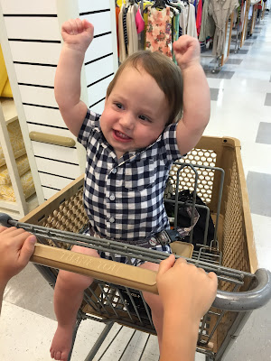 Every month we are seeing more and more of his personality. He is loving interacting with games like peek-a-boo and and repeating animal sounds that we make when we read to him from his animal books. Two of my favorite things he does right now is sniff/smell when he sees flowers and make a pig noise when we say "pig" or point to the pigs in his books.