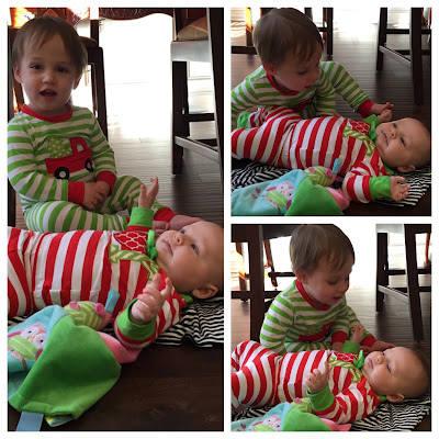 He's liked walking backwards for a little while now, but this month he added in sideways walking and "high knees" that his cousin Maddox taught him. He says it while he's doing it "hiney, hiney, hiney!" and it is hilarious! He also loves to dance. Dancing with the dancing Santa at Nonna's house was a highlight this month, and anytime he saw a pretend Santa outside of Nonna's house, he would say, "Santa. Datz" and start wiggling his body. :)